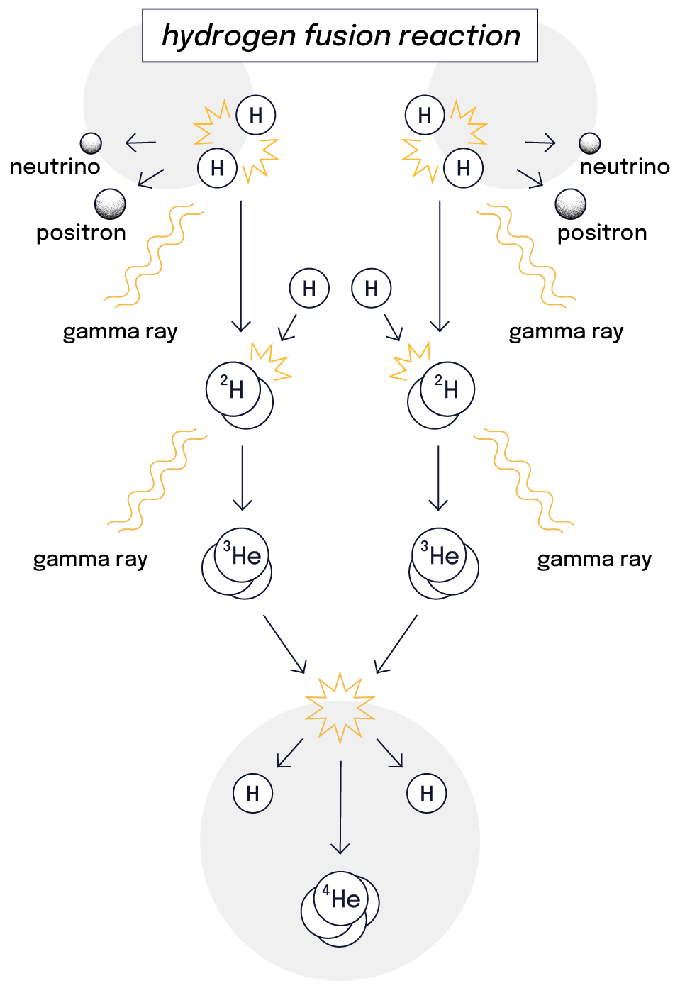 Les atomes sont animés d'un mouvement incessant. Plus ils sont chauds, plus ce mouvement est rapide. Au cœur du Soleil, où la température atteint 15 millions de degrés, les noyaux d'hydrogène entrent en collision à des vitesses très élevées. Ils peuvent ainsi franchir la barrière que les forces électrostatiques dressent entre les charges électriques positives dont ils sont porteurs. En fusionnant, les noyaux d'hydrogène donnent naissance à un noyau d'hélium.